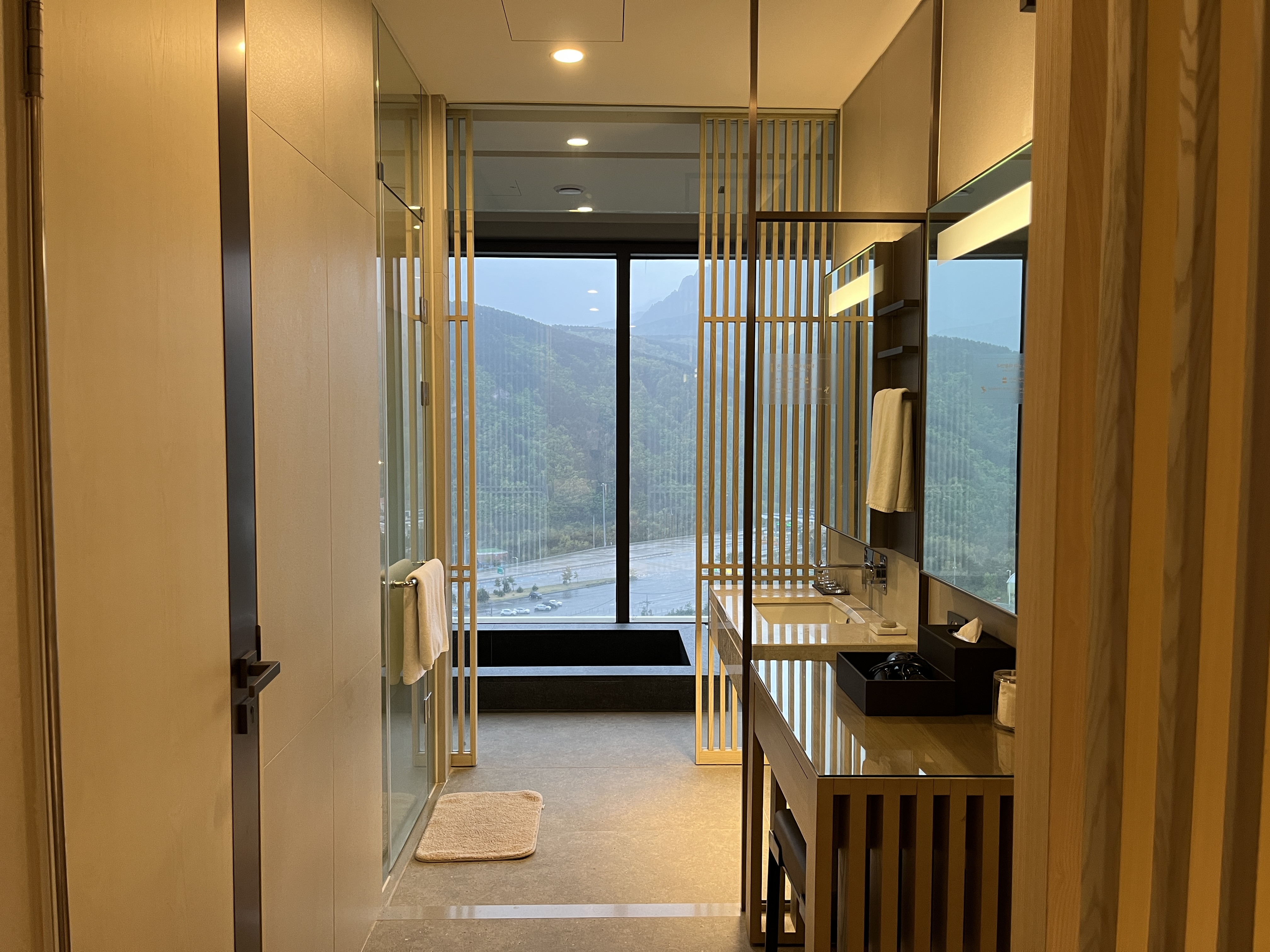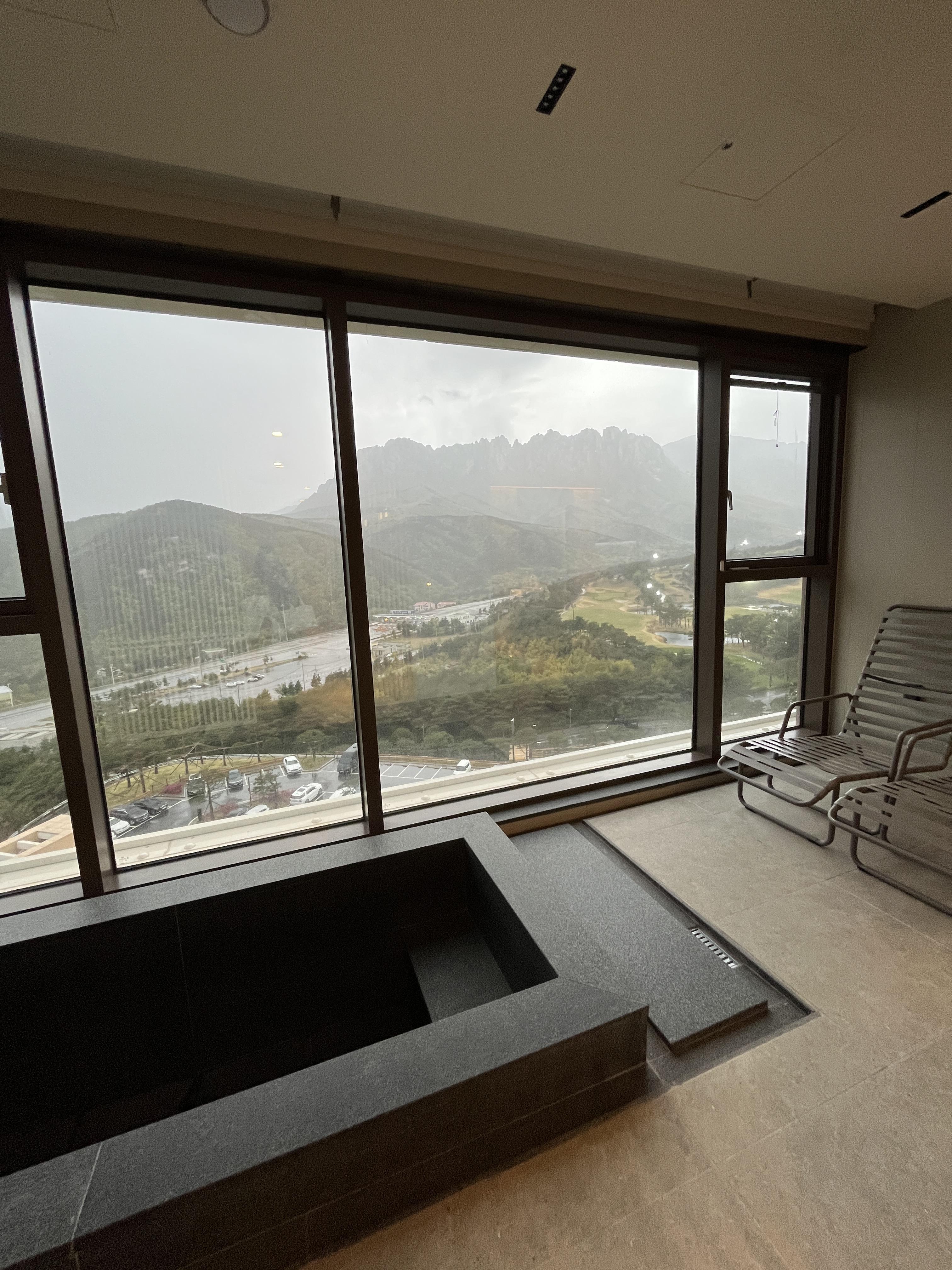 이번에는 이용하지 못했던 스파룸이지만 지난번 이용 기억을 떠올리자면 욕조가 매우 크기 때문에 물 받는 시간이 굉장히 오래 걸립니다. 이용하실 예정이라면 물 받는 시간을 여유롭게 생각하기를 추천드립니다. 이 스파는 천연온천수가 나오는 것이 장점이며, 울산바위뷰를 바라보며 스파를 즐길 수 있답니다. 또한 선베드도 2개가 구비되어 있습니다.