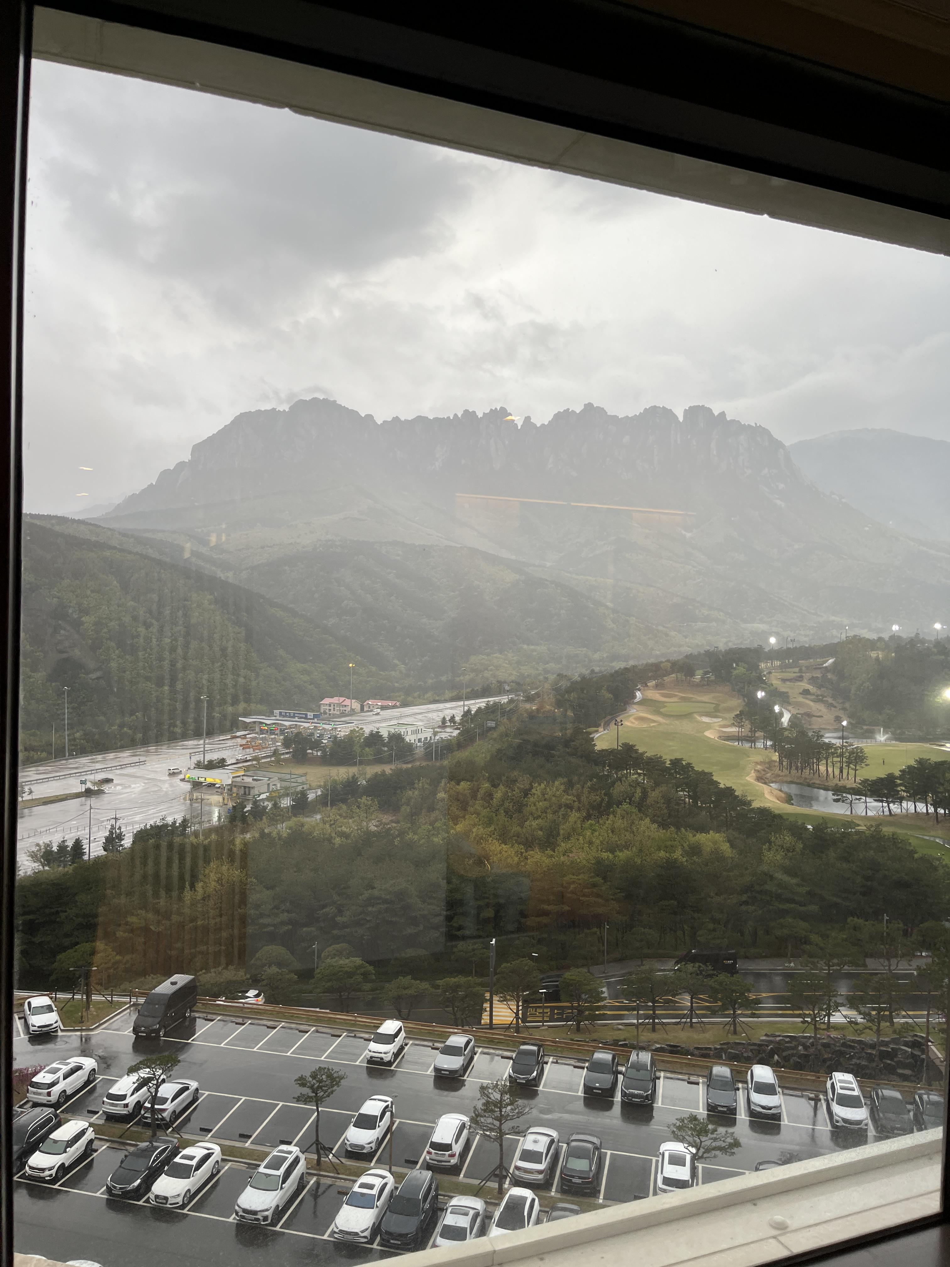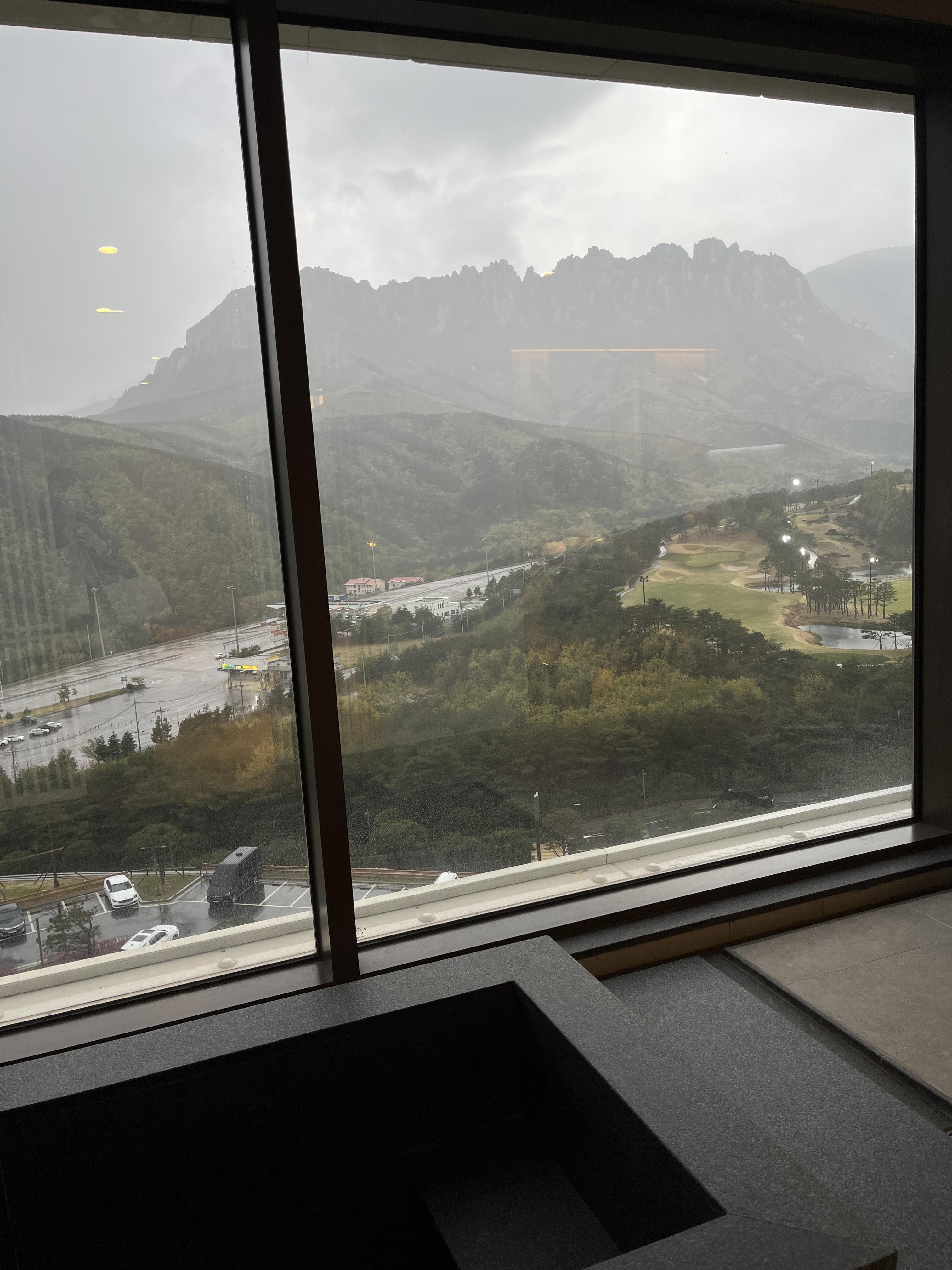 이렇게 울산바위를 정면으로 만나볼 수 있답니다. 심지어 소파에서 앉아있을 때 굉장히 정면에 위치하고 있다는 점이 장점입니다. 실버스위트룸은 좀 더 고층이었는데, 이번에 배정받은 방의 위치가 더 좋습니다. 한 가지 아쉬운 건 날씨가 흐렸지만, 그래도 운치 있는 모습이 좋았습니다.