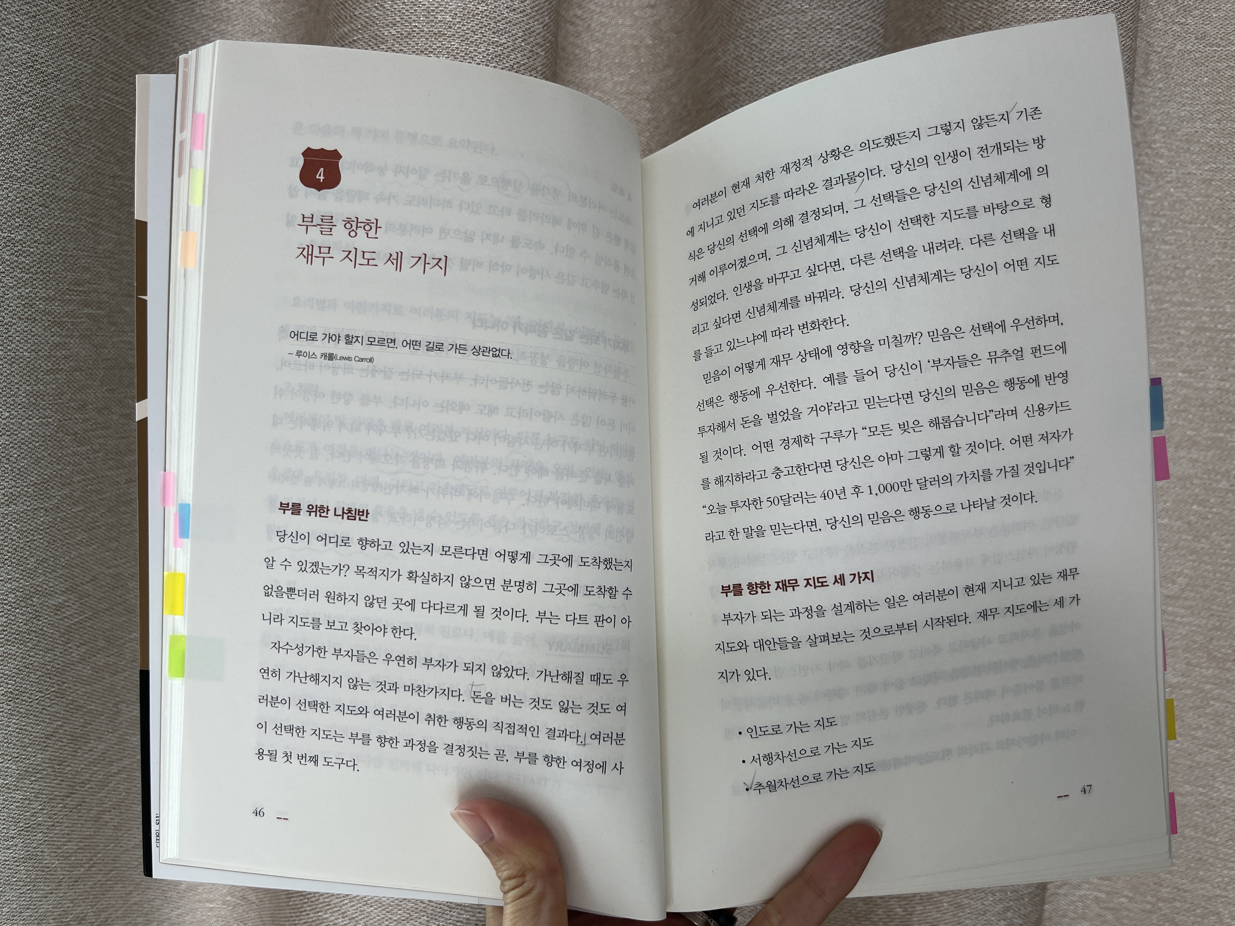 "백만장자는 사건이 아니라 과정에 의해 만들어진다"라는 여러 가지 예시를 통해 부를 얻는 것은 하나의 사건이 아니라 일련의 과정이라는 것을 이야기해 주며, 또한 부자기 되는 공식을 풀기 위해 네 가지 요소를 이해해야 한다며 앞으로 다루어질 PART에 대해 살짝 언급해 줍니다. 지도는 경제관념과 부, 돈에 대한 신념을 뜻하는데, 이 1) 지도는 인도로 가는 지도(→가난), 서행차선으로 가는 지도(→평범한 삶), 추월차선으로 가는 지도(→부) 세 가지로 나누어지고 PART3-5에서 깊이 소개될 예정입니다. PART6는 2) 차량(자기 자신, 최대의 효율을 낼 수 있도록 계속 점검, 정비해야 함), PART7은 3) 길(재정적 진로, 수많은 길 중 하나를 선택해 나아가야 함), PART8에서는 4) 속도(생각을 실행으로 옮기는 일이자 능력)에 대해 소개할 예정입니다.