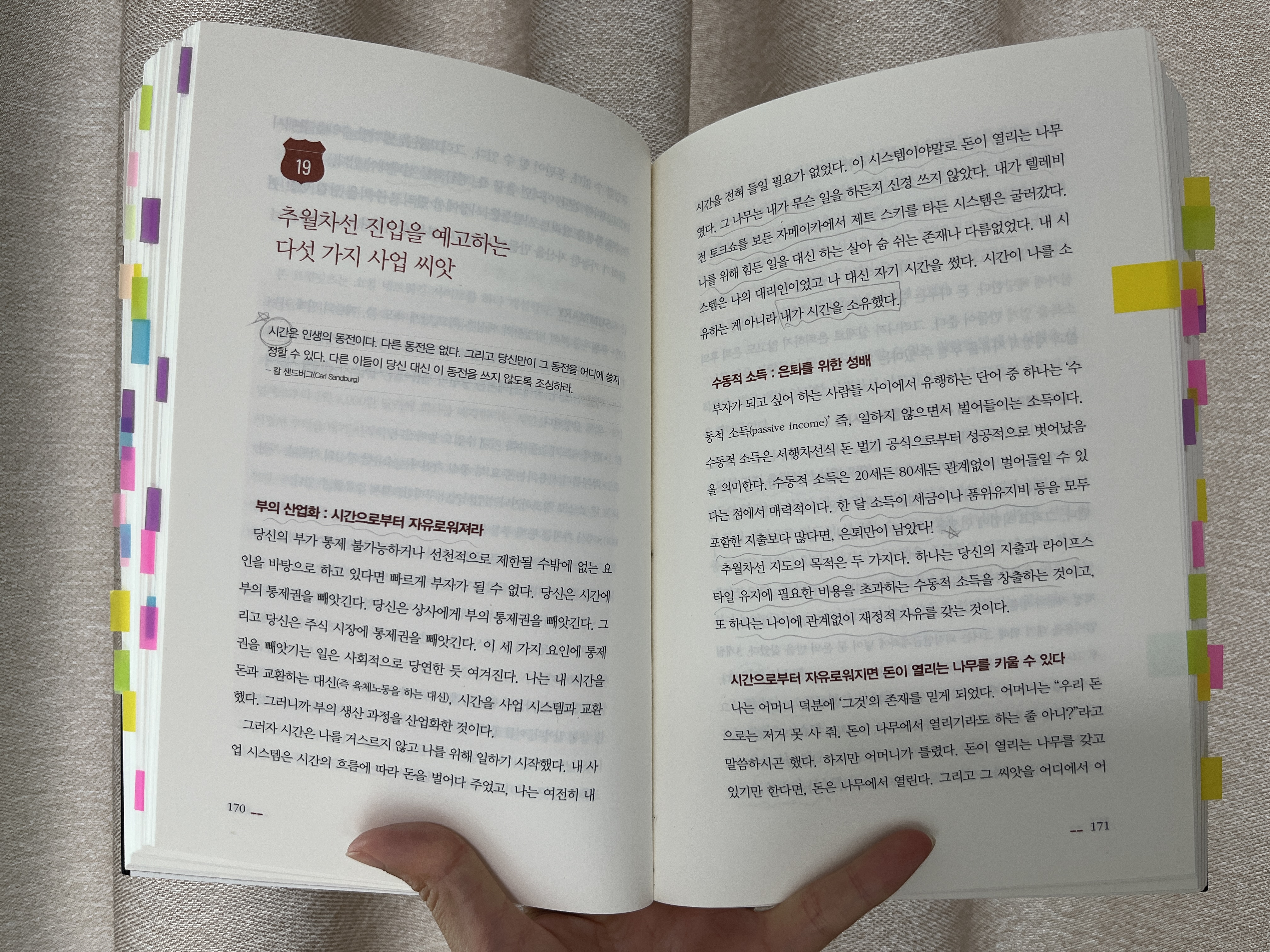 P172. 사업가가 되고자 하는 사람들 중 상당수가 "스스로 사장이 되라" 또는 "사랑하는 일을 하라!" 같은 유혹에 이끌려 길을 헤맨다. 그리고 직업에 인생을 저당 잡혀 사업의 노예로 전락하고 만다.... 그녀는 시간을 돈과 맞바꿔야만 하는 덫에 걸린 기분이었다.