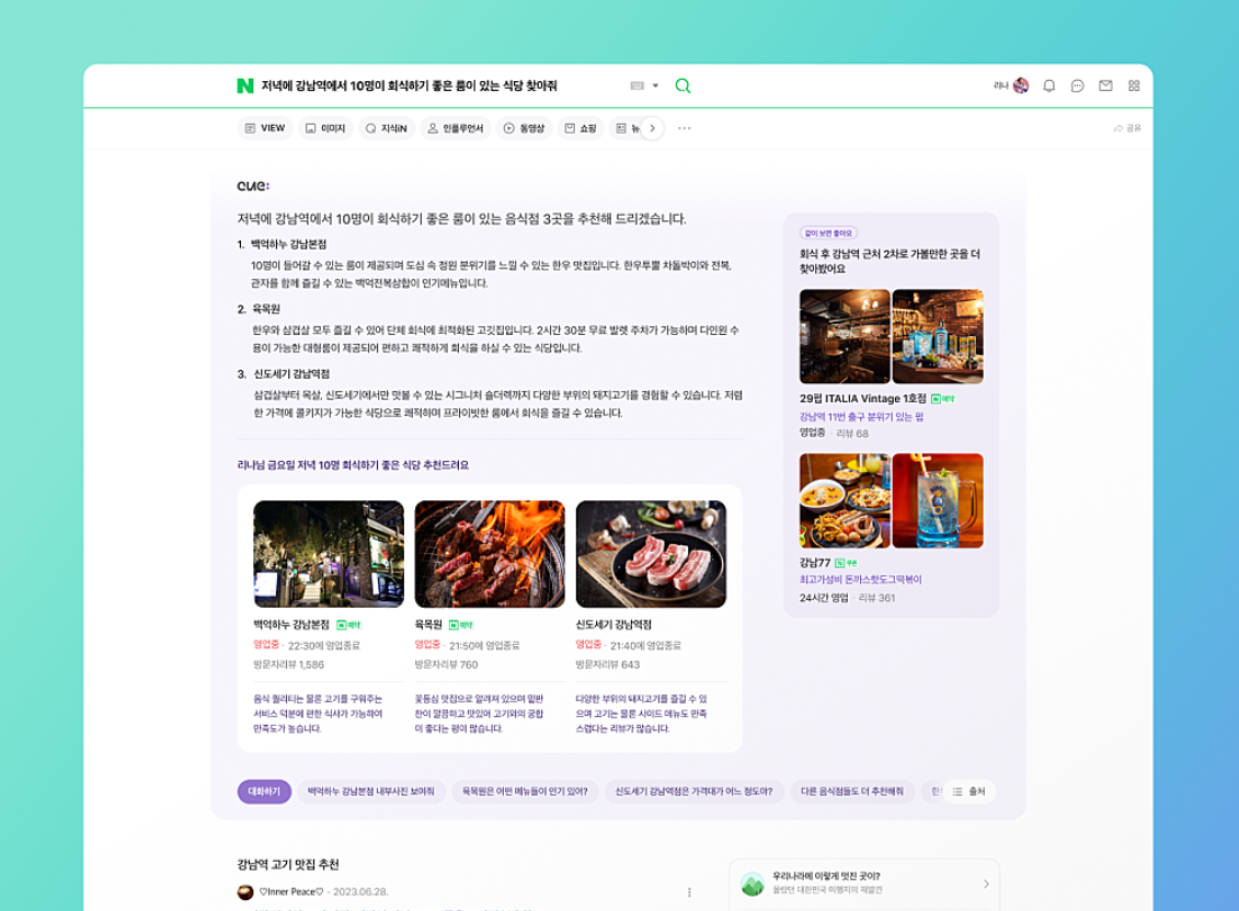 네이버는 검색 기반 네이버 서비스 연계에 큐를 중심축을 활용할 예정입니다. 사용자는 큐를 통해 단순 검색을 넘어 쉽고, 간편한 쇼핑, 예약 등을 진행할 수 있게 됩니다. 아래 사진과 같이 여러 의도를 포함한 긴 질문을 이해하고, 신뢰도 있는 최신 정보를 요약하여 제공할 수 있다고 합니다.